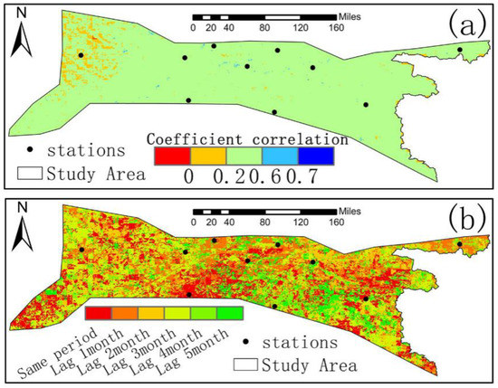 Spatial distribution of maximum cross-correlation (a) between NDVI and humidity index and time-lag response (b) in the Menggan region.