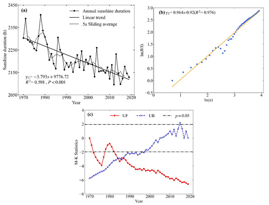 (a) Inter-annual variation, (b) Hurst index and (c) M–K mutation test of the annual SD in China (UF and UB refer to the positive sequence curve and reverse sequence curve, respectively; the same is true below).
