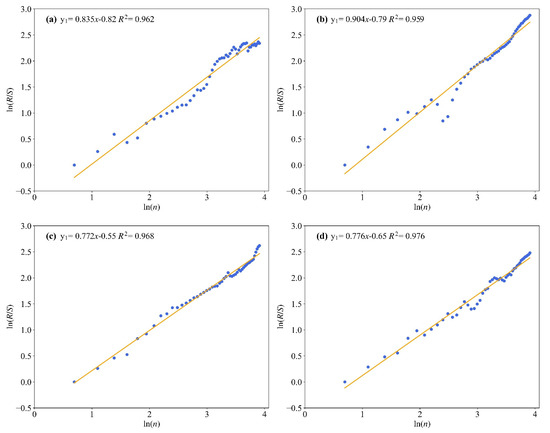 When has the relationship of , this means that the time series SD has a Hurst phenomenon. H is called the Hurst exponent, and its value can be obtained by least square fitting in the double logarithmic coordinate system [36]. Generally, the H value is divided into three cases. When H = 0.5, there is no correlation between the changes before and after the time series. When 0 < H < 0.50, it indicates that the future change trend of the time series is opposite to the past, that is, the process has anti-persistence—the closer it is to 0, the stronger the anti-persistence. When 0.50 < H < 1.00, it indicates that the future change trend of the time series is consistent with the past, that is, the process is continuous, and the closer it is to 1, the stronger the persistence.