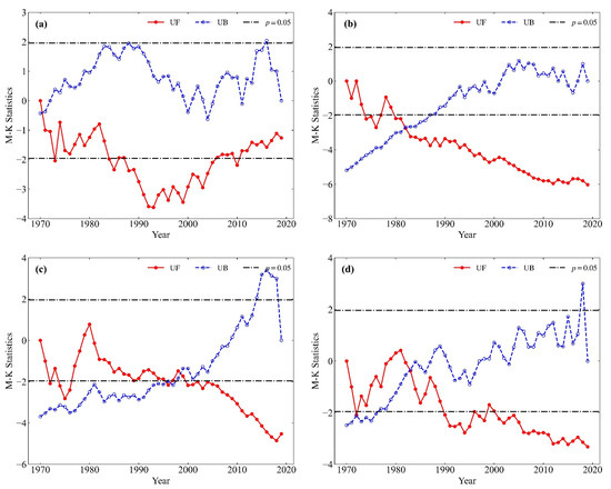 M–K mutation test of SD in (a) Spring, (b) Summer, (c) Autumn, and (d) Winter.