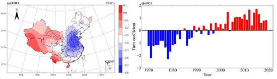 The empirical orthogonal function (EOF) decomposition is an important method to analyze the characteristics of temporal and spatial changes in meteorology [37,38]. It can decompose the variable field to obtain the space function part that does not change with time and the time function part that only changes with time. The main temporal and spatial variation characteristics of the variable field are reflected by those with large variance contribution rates. The space function part is composed of multiple mutually independent and orthogonal space modes, which are also called eigenvectors. The time function part is composed of the projection of the space mode on time, which is represented by the time coefficient. In this study, after using EOF decomposition, the original variable field information is concentrated in the first few modes, and then those spatial modes that pass the North significance test are used for subsequent analysis.