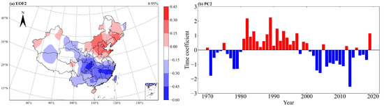 The variance contribution rate of the eigenvectors of the second mode is 8.93% (Table 2). The eigenvector space of the second mode is oppositely distributed in the north–south direction, with the Yellow River from Ningxia to Shandong as the boundary (Figure 7a). At the same time, negative values appeared in some regions such as Xinjiang and Northeast China, which indicates that the changes in SD in this region are complex and may be affected by terrain and latitude. In addition, the centers of negative values are mainly distributed in Fujian, Jiangxi, Sichuan Basin and its surrounding areas, while the centers of positive values are mainly distributed in northern Shandong, which shows that the changes in SD in these areas are more violent than those in other areas. Figure 7b shows that the time coefficient is basically positive from 1981 to 2000, which shows that SD shows a decreasing trend in the area south of the dividing line, and on the contrary, it shows an increasing trend in the area north of the dividing line. In addition, the time coefficient is basically negative before 1981 and after 2000, which shows that SD shows an increasing trend in the area south of the dividing line, and on the contrary, it shows a decreasing trend in the area north of the dividing line.