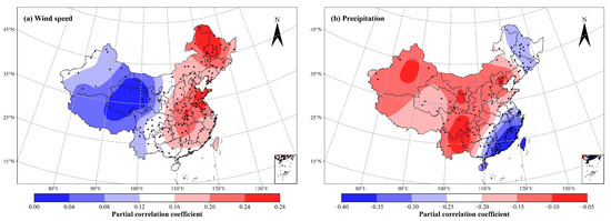 Partial correlation coefficient of SD with wind speed (a) and precipitation (b) (• indicates sites that passed the p < 0.05 significance test).