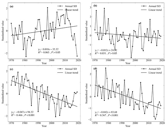It can be seen from Table 3 that annual and seasonal SD are significantly positively correlated with wind speed and negatively correlated with precipitation, and both have passed the significance test. Annual and seasonal SD were positively correlated with temperature and only passed the significance test in spring, summer and winter. Annual and seasonal SD were negatively correlated with relative humidity and only passed the significance test in spring and summer.