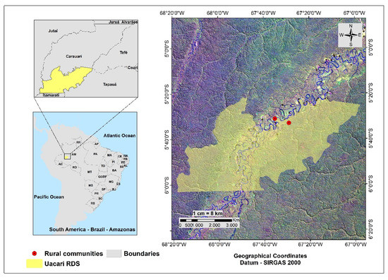 The research was carried out in the Middle Juruá Region, in the Uacari RDS located in the municipality of Carauari in the southwest of the state of Amazonas (Figure 1). The RDS is a governmental protected area aiming for ecosystem preservation and achieving the sustainable development of local traditional riverside populations. The RDS Uacari was created by Decree No. 25.039 of 1 June 2005, from a demand of traditional populations in the region and has this name in honor of a primate (Cacajao calvus uacayalii) found in the area that is threatened with extinction [9].