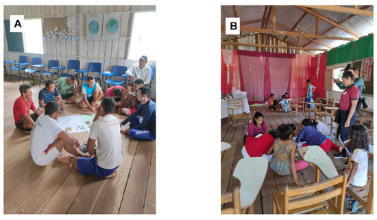 Data collection was recorded with the application of a field diary and photographs. The activities were carried out in July 2022, the period of the Juruá River’s ebb. In the community of Santo Antônio do Brito the workshop took place at the school, while in Vila Ramalho the activity took place at the church (Figure 2A,B).