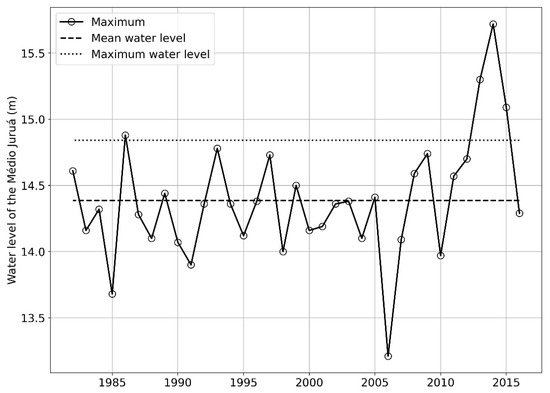 Maximum river levels on the Médio Juruá are presented in Figure 3. Levels above 14.8 m are classified as severe floods. In between 1982 and 2016, four extreme floods were identified, and three of them occurred since the year 2010, in consecutive years, 2014 reaching the highest level of 15.7 m. Despite the years from 2017 to 2021 are not presented in the graph, due to the problems previously discussed, the years 2019 and 2021 were also identified as major floods. The water levels reached a peak of 31 m in 2019 and 31.7 m in 2021, the highest level recorded for the river since observations started. Some studies have associated the 2021 flood with the intensification of Walker circulations caused by the anomalous cooling of the Pacific Ocean [21], this cooling phenomenon is called La Niña and is associated with the great floods observed in the Amazon during the 21st century (2009, 2012 and 2021).