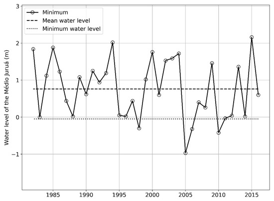 Minimum water levels recorded on the Médio Juruá river in Carauari from 1982 to 2016.