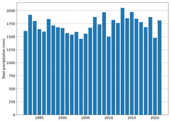 Total precipitation (mm) from the ERA5 reanalysis over the Médio Juruá basin for the flood season (November to April) from 1992 to 2021.