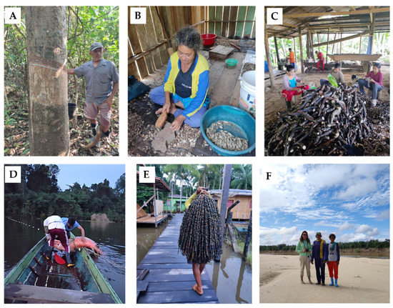 Socio-productive and conservation activities of the populations of Médio Juruá: (A) rubber tapper; (B) seed collector; (C) farmers in manioc flour house; (D) Pirarucu fisherman; (E) açaí collector, and (F) watchmen at turtle protection beaches.
