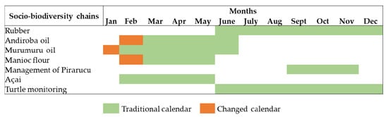 The script for preparing the calendar consisted of listing the socio-biodiversity chains developed in each community, organizing them by the degree of economic importance, indicating the traditional production period, the changed production period, and the causes of these changes. The group reported the main losses caused by climate change in the communities and the spontaneous adaptations made by the community members. After the presentation of the final calendar, losses, and adaptations, the moderator questioned the group about the results and then collectively validated the answers. In this way, the results were discussed based on a descriptive analysis.