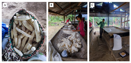 Stages of manioc flour production: (A) cassava; (B,C) preparation of cassava flour.