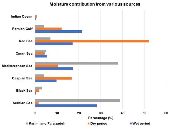 Percentage contribution of various moisture sources to precipitation in Iran during the wet and dry periods [,].