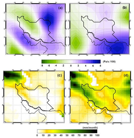 Spatial distribution of atmospheric stability (ω) (a,b) derived from NOAA website [] and precipitation amount (c,d) over Iran derived from CRU3.23TS datasets [] for the dry and wet periods, respectively.