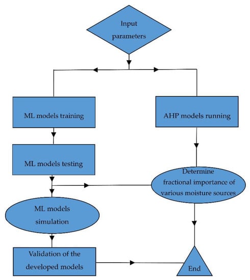 Since Thomas L. Saaty developed the AHP method in the 1970s [], it has been applied in numerous studies to organize and analyse complicated scenarios. In addition to AHP, ML methods can be applied to investigate the fractional importance of individual moisture source affecting the amount of precipitation in Iran. Although the application of ML methods in different aspects of the hydrological and climatological sciences, such as in [,,,,,,,,], has increased substantially during the last few years, comprehensive studies on the application of ML methods in moisture source investigations are lacking.