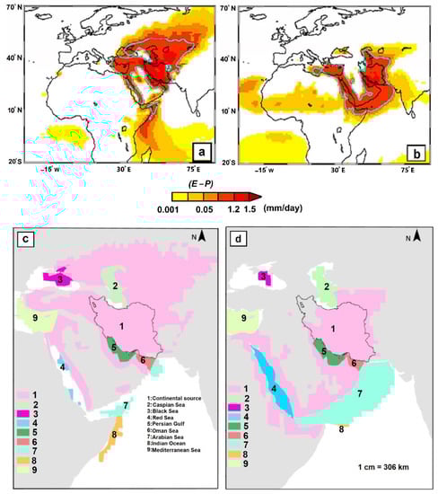 Variation in (E − P) > 0 (mm/day) in dry (a) and wet (b) periods [,] (E, evaporation; P, precipitation). The spatial distribution of moisture sources for Iran during the dry (c) and wet (d) periods.