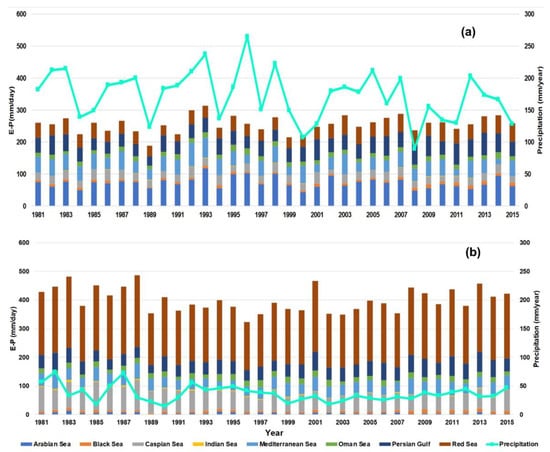 The (E − P) > 0 values obtained by backward trajectory analysis of air masses arriving over Iran illustrate the spatial distribution of the main moisture uptake sources and changes in spatial extension between the dry and wet periods (Figure 4a,b) []. The blue line in Figure 4a,b, shows 95% of the (E − P) > 0 annual values, and the 5% area, which is located inside the blue line, represents the (E − P) > 0 values of 0.15 mm/day and 0.12 mm/day for the dry and wet periods, respectively. Furthermore, the dominant moisture uptake sources have also been shown for the dry and wet periods (Figure 4c,d).