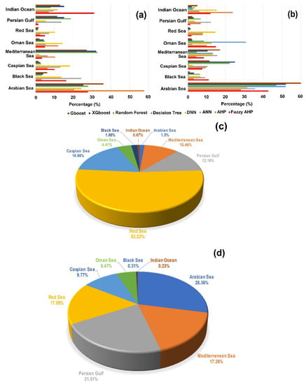 To study the fractional importance of various moisture sources that influence precipitation in Iran, AHP (simple and fuzzy AHP) methods were used first. During the wet period (Figure 6a), when most of the precipitation occurs in Iran, the Arabian Sea had a dominant fractional importance in influencing the amount of precipitation in Iran according to results of both AHP models. The results of the ML models also verified the dominant effect of the Arabian Sea. The Arabian Sea, as the dominant moisture provider for Iran with a share of 28.3%, was verified as the predominant influence on precipitation amounts (the fractional importance of this moisture source varied from 28.1% in AHP to 60.1% in the Gboost models). However, the Red Sea and Persian Gulf, with high contributions toward moisture with shares of 17.1% and 21.5%, respectively, had a weak influence on the amount of precipitation. The fractional importance of the Red Sea varied from 0.0% in Decision Tree to 14.6 in DNN models, whereas that of the Persian Gulf varied from 0.2% to 12.3%, respectively. In contrast, the Black Sea and Indian Ocean, which make a very weak contribution to moisture provision for Iran with shares of 0.31% and 0.23%, respectively, had a stronger role in influencing the precipitation amount. The fractional importance of the Black Sea varied from 0.46% in Decision Tree to 11.08% in fuzzy AHP models, whereas for the Persian Gulf, it varied from 2.1% in XGboost to 23.9% in AHP models. These differences between the moisture contribution and fractional importance of the moisture source that influences precipitation in Iran are because of local parameters. These local factors influence atmospheric moisture and cause precipitation. For instance, moisture from the Red Sea and Persian Gulf normally cannot be transferred deep inside the Iran Plateau, and these sources normally influence low-elevation regions in the southern part of the Zagros Mountains []. In this region, climatology is not appropriate for precipitation to occur []. However, moisture from the Black Sea is transferred to Iran via a maritime polar air mass which mainly influences the north-western part of the country. The climatic conditions for moisture from the Black Sea to transform into precipitation are entirely appropriate in this part of Iran.