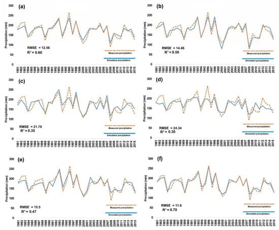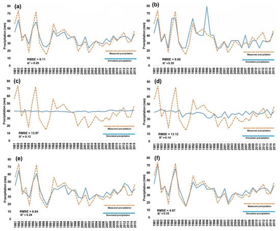 Time series of measured monthly precipitation amounts from the Climatic Research Unit (CRU3.23TS) dataset [] compared to simulated precipitation amounts obtained from the various machine learning (ML) models including (a) Random Forest, (b) Decision Tree, (c) ANN, (d) DNN, (e) Gboost, and (f) XGboost during the wet period. RMSE and R2 values indicate the accuracy of the developed ML models.