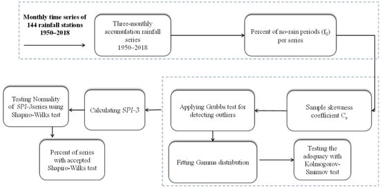 Finally, the normality results were examined in the light of the following factors: the sample size, station location, Grubbs’ test results, frequency f0 of the occurrence of no rain, and population asymmetry coefficient Cs. Figure 2 shows the inputs of the study (monthly rainfall series of 144 stations), its outputs (SPI-3 series and the percentage of the series with an accepted normality test), and the steps to bridging them.