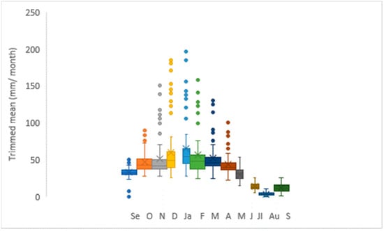 Figure 4 shows the box plots of the monthly trimmed mean, considering the threshold of 3%. The seasonal variability is highlighted, with July as the driest month and January as the wettest month. In total, for the period of 1950–2018, 98 stations totaled more than 30 years of observations for every calendar month, representing 59,032 station-months at monthly level. The maximum monthly sample size was 69 years corresponding to a single station (51,672) without gaps. In contrast, 45 stations out of 144 had fewer than 31 years of observations per month during the period 1950–2018. Nineteen of them are stations that opened before 1931. For stations with more than 30 years of observations for every month, the ratio of the number of gaps to the number of station-months was 14%. At station scale, the median rate of gaps was 9%. Per month, the mean rate of gaps was 14–15%, except for July and August, where it was higher (17–18%).