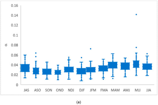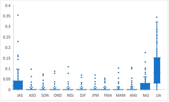 The percentage of zero rain (f0) during 3-month periods varies, as shown in Figure 5 as a box plot representation. A singular value exceeding 0.35 was found for one single station from July through September. For a few stations, f0 exceeded 0.25 for June–August, which corresponded to the summer season. The lowest f0 frequencies displaying the lowest variability corresponded to the 3-month period of February–April (Figure 5), which encompasses the rainy season.