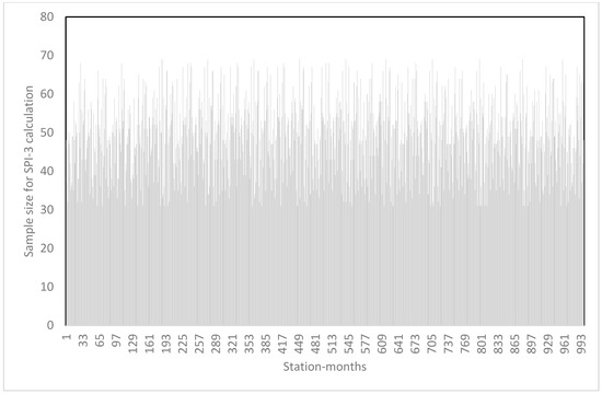 The fitting of the two-parameter gamma distribution for every 3-month period and the use of the Kolmogorov–Smirnov test at a 5% confidence level resulted in its acceptation for 1205 station-months. For 206 out of 1205 3-month periods (17%), the normality of SPI-3 was rejected using the Shapiro–Wilk test. Figure 6 shows the sample sizes for series not rejected by the Shapiro–Wilk test. Figure 6 shows that the number of samples having more than 50 years of observations for 3-month periods was not trivial and was favorable for inferring a statistical analysis.