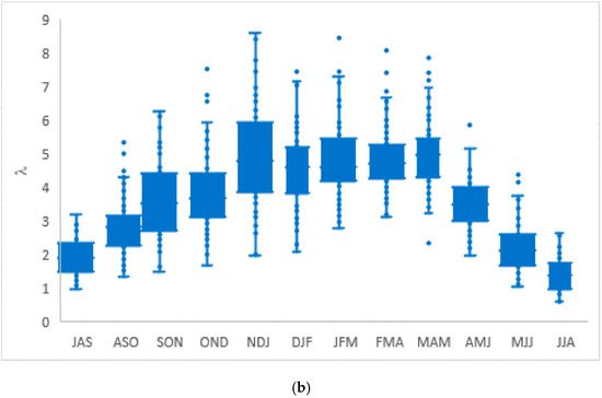 Figure 7a,b shows the temporal variability of the gamma distribution parameters for those cases where the normality of SPI-3 was not rejected. There is a clear seasonal effect in both parameters. Figure 7a,b shows that the seasonal curve was more accentuated for the shape parameter than for the scale parameter. One single station (code number 51688) seemed singular for the scale parameter (0.14) corresponding to a 3-month period (May–July). This station had a sample size of 31 years with f0 = 0. Its skewness coefficient was not very high (Cs = 0.74), but its Grubbs’ test was rejected, which might explain this singularity.