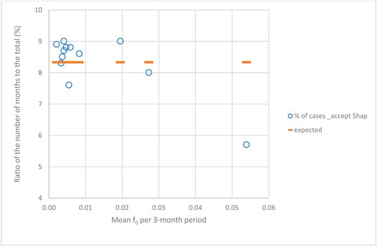 Contribution to the annual total r (%) of an accepted normality test for every 3-month period versus the corresponding mean value of f0.