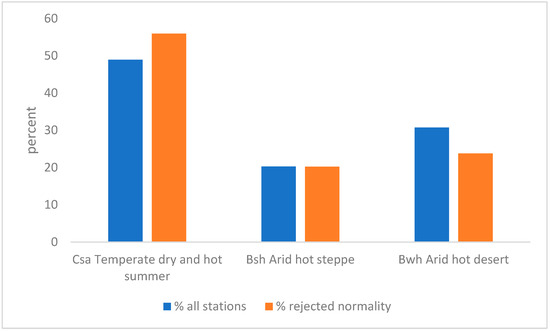 The analysis of the percentage of rejection with respect to the climate category was undertaken. The network composition was 49%, 20%, and 31% of stations categorized as Csa, Bsh, and Bwh, respectively. In comparison, 56%, 24%, and 20% of the 84 rejected stations were in categories Csa, Bsh, and Bwh, respectively. Thus, the category Csa was over-represented in the sample of rejected cases, while Bwh was under-represented. Figure 10 compares the histograms when considering the entire network versus the histograms when considering stations with rejections.