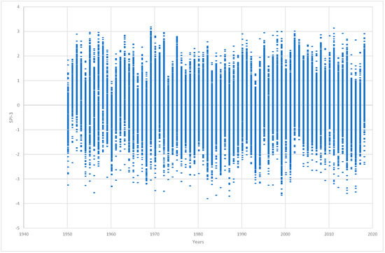 The percentage of SPI-3 being less than −3 was 0.12% (63 out of 48,835). The total percentage of values out of the interval (−3, +3) was 0.14%, which is very low in accordance with literature recommendations [1]. The minimum estimated SPI-3 was −3.803 for station 50535, corresponding to December–February 1982. A study of drought occurrence in the Mediterranean region using SPI-12, SPEI-12, and two other indicators showed that 1982 achieved the most severe drought in the North Africa region [23]. Conversely, only eight (8) SPI-3 estimates were greater than +3, and the maximum was 3.181, which corresponded to period 3 (September–November) of 1969 at station 58272. The autumn of 1969 is well-known for its dramatic floods in Tunisia. Thus, our results are accurate in regards to SPI-3 interpretation when considering the fact that we did not remove outliers.