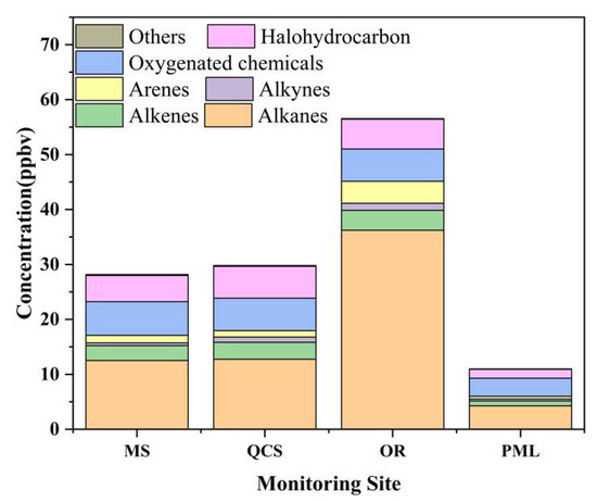 | City | TVOCs (ppbv) | Alkane (%) | Halogenated Hydrocarbons (%) | OVOCs (%) | Arene (%) | Olefins (%) |