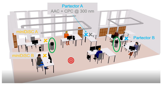All of the following comparisons between simulation and experiment were conducted in an office room of the Institute for Energy and Environmental Technology (IUTA) e. V. in Duisburg (Germany) in August 2021. The floor area of the room was measured to be 95.5 m2, and the volume 311.3 m3. The room was furnished with several desks, as shown in Figure 1. Four miniaturized measurement instruments were used across the room, consisting of two miniDISC (Fachhochschule Nordwestschweiz; prototype of the later commercialized DiSCmini, Testo GmbH) and two Partector 2 [16]. Both of them measure the total quantity of concentration with reasonable accuracy [17]. As a reference, an aerodynamic aerosol classifier (AAC, Cambustion) was used to classify 300 nm particles, which were then measured with a water-based condensation particle counter (CPC, TSI model 3787). This size is representative for SARS-CoV-2 propagating in fine exhaled droplets. One Partector 2 and the AAC were positioned close to each other in order to calibrate all instruments to the same metric. It should be noted that the particle-measuring devices were directly placed on the table without any stand or offset. It is not known whether a boundary layer developing on the surface of the table could in turn affect the accuracy of the particles measured from this device, with boundary layer sizes expected to be of the order of 1 centimeter in this area [18].