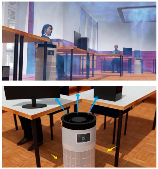 Rendered CFD visualization of the two air cleaning devices in the room. The airflow to the device is shown in yellow and the filtered airflow away from the device in blue.