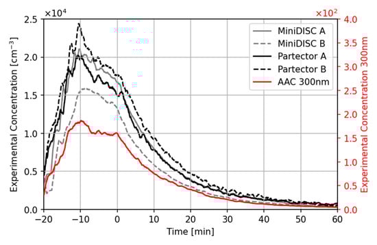 At the start of the test, the atomizer was operated to emit polydisperse particles with a modal diameter around 100 nm into the room. The emission rate of 300 nm-sized particles was determined to be 1.31 × 107 s−1 at an atomizer pressure of 1 bar and 9.27 × 107 s−1 at a pressure of 3 bar, by measuring the steady-state particle concentration for the operation of an air cleaner with a known CADR in a standardized 30 m³ test chamber. The ceiling fan was turned on during the particle generation phase to allow the particles to homogeneously disperse in the room. The measurement equipment readings confirmed a homogenous distribution of particles with a close-to-constant particle concentration across all measurement devices, as shown in Figure 5, which is in line with previous experimental findings [33,34,35]. At this point, the ceiling fan was turned off and the two air cleaners were turned on so that there was no additional forced convection in the room beyond the effect from the air cleaners themselves. The time at which the air cleaners were turned on marks the time, and defines the initial condition of the simulation.