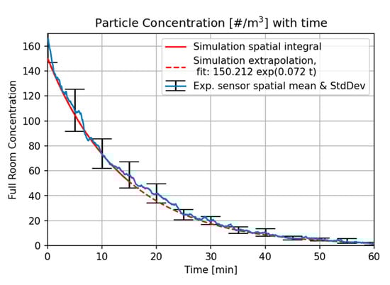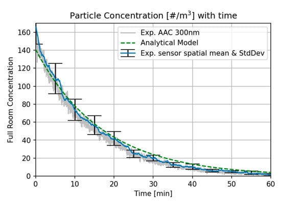 where is the particle concentration in the room, the initial room concentration, and the room volume [36,37]. Figure 6 shows the room averaged concentration. The results from the AAC device are marked in grey, while the results from all other measurement devices are averaged out in space and time with a moving average to produce the blue curve. The error bars are computed from the spatial differences observed across the room, and represent the standard deviation across the room.