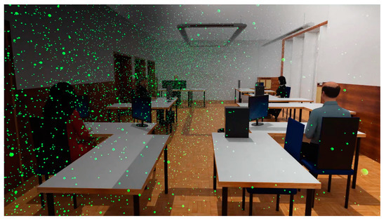 Particles at a certain point in time simulated inside room.