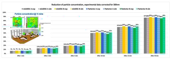 Reduction in the particle concentration after different operation times, determined by experiment and simulation.