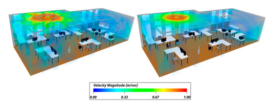 This validation and demonstration of the benefits of simulation is an initial point of research, which is expected to evolve towards systematic optimization of air quality in built environments. While these examples only portrayed the effects of standalone air cleaners, it is expected that the same approach can be applied to HVAC system installations, optimizing the location of inlets and outlets for maximum safety. This can then be combined with human comfort and energy efficiency estimations in order to help balance all three attributes simultaneously.