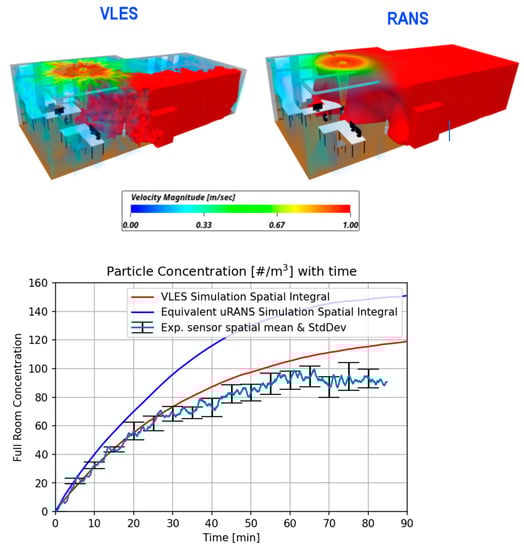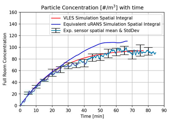 The spatially averaged particle accumulation over time for all the four simulations is compared with experimental results in Figure 12 and Figure 13. Starting with the scalar modelling results of Figure 12, neither the VLES nor the equivalent uRANS results are able to capture the expected concentration stabilization caused by the natural decay of particles in the room. In addition to this, the equivalent uRANS results also provide less accurate results when matching the experimental curve slope. When we look at spatial distribution, the equivalent uRANS results also show a more homogenous distribution of particles in the top right corner of the room, owing to inaccurately represented turbulent flow from the air filtration device.
