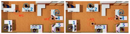 Geometry of baseline (left) and changed filter position (right). AF1: air filter 1, AF2: air filter 2. The numbering of the people locations in blue remain as previously.