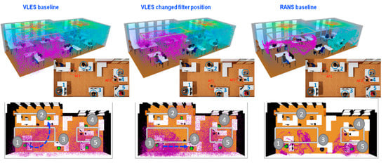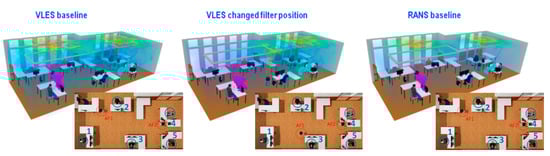 After 50 s, in the baseline VLES model, the particles from male 1 rise up towards the ceiling and start spreading inside the room as shown in Figure 16. The particles released from female 5 are pulled towards the air filter. A part of these is sucked in and the rest is entrained by the outlet flow to spread across the room. These particles then travel and spread in the region of the coughing female 5. A similar behavior is observed for the particles released from female 5 in the VLES model with a changed filter position. However, the particles emitted from coughing male 1 do not directly travel to air filter AF1. The particles are carried upwards by the flow after interacting with the monitors. In the equivalent uRANS model, the behavior of the particle movement is the same as in the VLES model, but the particles emitted from the two occupants (male 1 and female 5) remain more clustered. Due to the localized high flow velocities near the filters, these particles do not travel far. In all the results, the particles released from both emitters have not yet reached the other occupants and there is no risk of contamination.