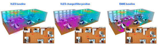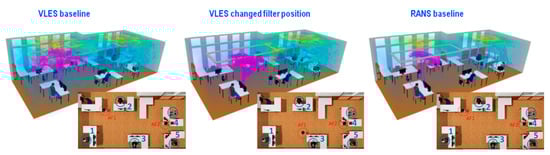 The particles continue to travel farther into the room in the VLES simulations. After 75 s, shown in Figure 17, the particles are now in close proximity of other occupants. In the baseline VLES results, the particles from coughing male 1 rise upwards and travel towards the other side of the room, where the air filter AF1 is placed, close to female 2. Similarly, for the VLES model with a changed filter position, the particles from the coughing male 1 rise up, spread in the upper area, and then travel towards air filter AF1 placed next to male 3. Due to this, the cumulative personal exposure for occupants 2 and 3 will vary as a function of the location of AF1: Female 2 is likely to receive more particles from male 1 in the baseline VLES simulation, whereas male 3 will receive more particles from male 1 in the VLES simulation with a changed filter position. The risk of exposure from particles released by female 5 is similar in both VLES models.