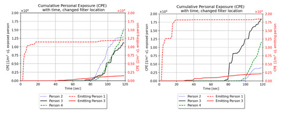 Figure 19 shows the cumulative personal exposure of the occupants from the particles emitted from coughing. Comparing baseline and changed filter location VLES simulations, it can be seen that altering the filter position increases the cumulative personal exposure of the room occupants. As discussed previously, occupants sitting closer to the air filters are exposed to higher quantities of particles in both baseline and changed filter position VLES models.