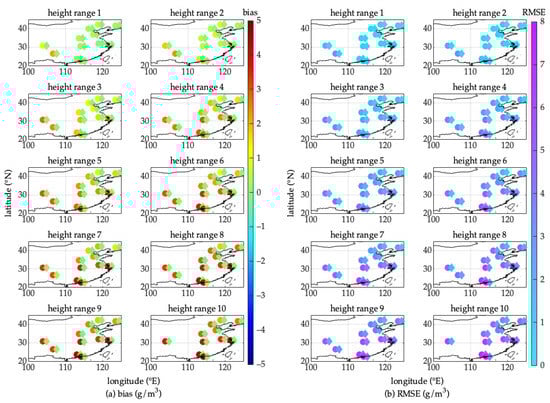 Figure 8a shows that the annual biases of at all the 12 stations increase gradually with the increase in the height of , and in the height range 2 or above, they are all above 0, which indicates that the exponential model only performs well within the height range 1, and all the positive bias values mean systematic overestimation of the model. In contrast, the biases of in the 10 height ranges all float around the 0 value. In Figure 8b, the annual RMSEs of the two models at the 12 stations all show a tendency of larger RMSE in greater height ranges, i.e., the RMSE increases with the increase in the height of , with different amounts of increase. Therein, the minimum increment in the RMSE of is 1.5 g/m3 (from 3.5 to 5.0 g/m3), and is at GUIYANG, where the RMSE of is from 1.1 to 3.1 g/m3; the maximum increment is 5.4 g/m3 (from 1.7 to 7.1 g/m3) and is at KOWLOON, where the RMSE of is from 1.4 to 3.9 g/m3. Noticeably, the RMSE of is less than that of in all 10 height ranges. Compared with the result, the RMSEs of at all stations in each of the 10 height ranges reduce at least 11%, 20%, 43%, 48%, 40%, 38%, 32%, 35%, 32% and 28%, see Figure 8c.