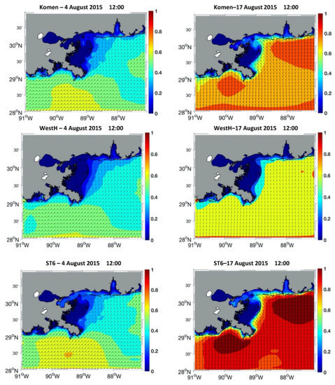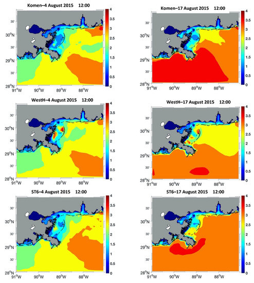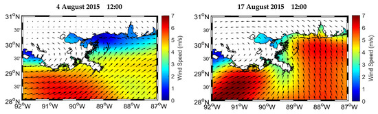 Figure 3 shows two examples of CFSR wind fields during August 2015, with prevailing winds varying from west to southeast. Times (4 August 2015 12:00) and (17 August 2015 12:00) were selected and are later used for further examination of the model results.