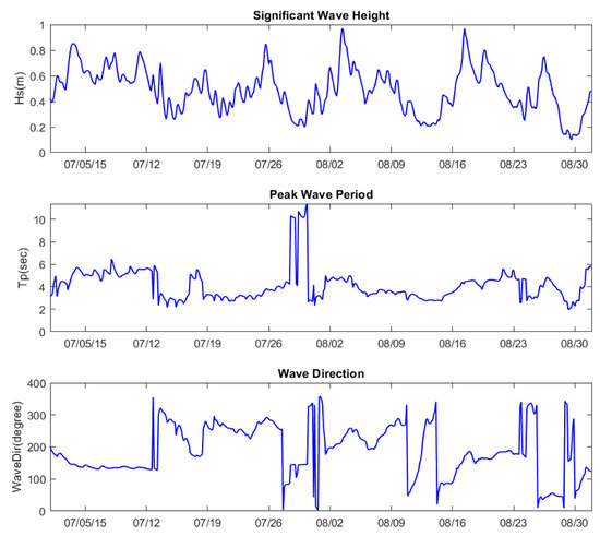 Boundary conditions along the open boundaries of the model were obtained from the Gulf of Mexico and the Northwest Atlantic 30-year hindcast by NOAA. The database was prepared by long-term simulation of waves using WAVEWATCH-III (WWIII) [34] forced by hourly winds from CFSRR. The spatial resolution of the WWIII model is 1/6 degree, and the temporal resolution is three hours. The model uses the ST4 physics package to include exponential wave evolution and whitecapping [35]. ST4 is an older whitecapping parametrization than ST6 and represents the dissipation of wind-generated waves in the spectral space considering wave breaking statistics and the attribution of swell decay as propagating over the oceanic basins. This formulation was derived to be consistent with field observation of swell dissipation [34]. Significant wave height, direction, and peak period at 3-h intervals were extracted along the three open boundaries of the model domain. Wave data extracted at the middle of the southern open boundary during the simulation period (July and August 2015) are shown in Figure 4. During this time, wave height was always less than 1 m with an average of 0.5 m, resulting from a substantial decline in wind stress over the inner and outer Louisiana shelf during summertime [19]. Regardless of small significant wave heights, peak periods were relatively large, with a maximum higher than 10 s and an average of 4.5 s, which implies swell propagation toward the inner Louisiana shelf. The dominant wave direction during this period was south to the west (180–270 degrees), which is typical during this time of the year.