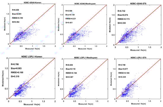 Scatter plots and model performance statistics for simulated wave height using the three whitecapping formulations compared to observations. Upper panels: NDBC 4040, lower panels: LOPL1, left panels: Komen, middle panels: Westhuysen, right panels: ST6.