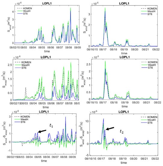 Three main source terms, including wind input, whitecapping, and quadruplet, contribute to the evolution of wave spectra. The generated spectral energy is balanced and redistributed at each timestep by whitecapping and quadruplet, respectively [2]. The resultant source term balance contributes to the final shape of the spectra and the associate wave parameters [41]. As shown in the previous section, Komen and Westhuysen generally underestimated wave heights during the two months of simulation, while the simulated values for mean wave periods were very similar. Both parameters, especially mean wave periods, were underestimated compared to observations. These results can be described by examining the source term balance from each model. The quantified values for wind input, whitecapping, and their difference that accounts for the total energy contributing to the total energy of the spectra for all three whitecapping formulations are compared and investigated at LOPL1 and during one-week periods containing times and (Figure 13). At both timesteps, the amount of wind input regarding the three formulations are more or less similar with a Westhuysen simulating a larger wind input and ST6 simulating the smallest one (Figure 13, upper panels). Unlike the wind input, whitecapping dissipation values simulated by different models are significantly different, especially ST6, compared to the other two models. The estimated whitecapping dissipation by ST6 is 50–70 smaller than that of Westhuysen at time slot 1 and up to 20 % smaller in time slot 2 (Figure 13, middle panels). The estimated whitecapping by Komen was more similar to that of Westhuysen but smaller than that. The difference between the wind input and whitecapping dissipation shows the net amount of energy contributing to the spectral redistribution and estimating wave parameters. As illustrated in the lower panel of Figure 13, this net amount is significantly larger for ST6 compared to the other two methods. The net energy corresponding to times and is specified in Figure 13. The comparative values for the three whitecapping formulations are consistent with the wave height differences between the three models in Figure 6B,C. However, it is only at time where the simulation accuracy is acceptable. Regardless of the differences in the amount of simulated net energy consequently, all models simulate similar patterns of wave height variations. In many cases, such as time , even the pattern of variations is different from the observations. This inconsistency could be due to inaccuracies associated with input data discussed in the following subsection.