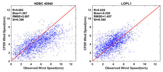 Evaluation of CFSR wind speed at NDBC 42040 and LOPL1.